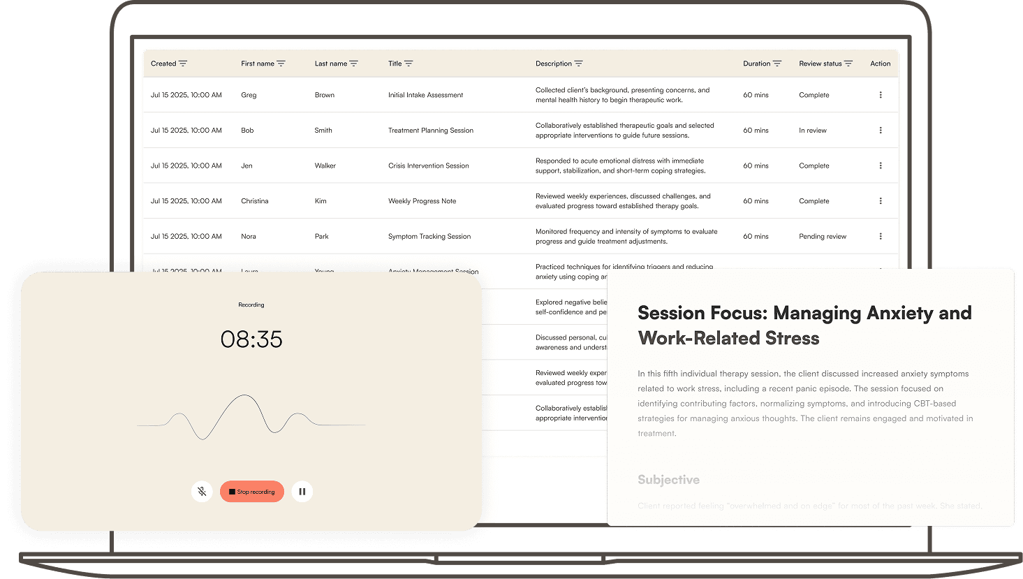 Start capturing a session with just a few clicks, dictate a summary, or upload a recording. When the session ends, your chosen template (SOAP/DAP/BIRP and more) is drafted automatically. Skim, make quick inline tweaks, then export in your preferred format in minutes. Runs in your browser and, by design, keeps all sensitive data within the US.
