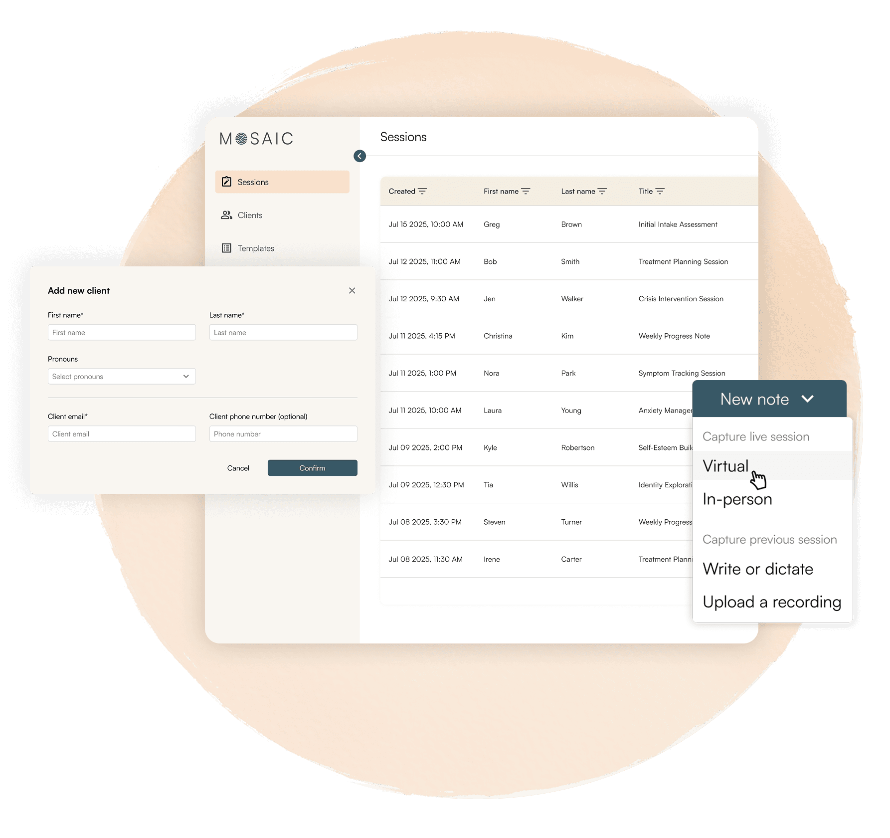 Start audio capture at the beginning of a virtual or in-person session, dictate a summary, or upload a recording at any time.